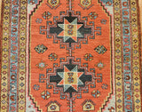 A beautiful, real Heriz rug in fantastic colour and condition. The orangey red ground colour is set off nicely by the abrashed light blue corners and main border, with a nice touch of pale gold in the minor borders. A really lovely, well balanced rug.