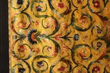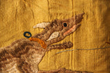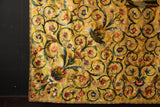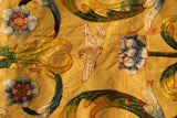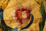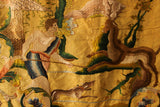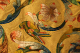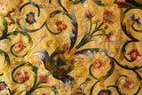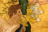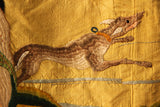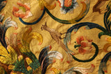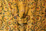 Exceptional embroidery from Northern Italy, handstitched circa 1720, it is a miracle survivor. Brightly coloured silks are embroidered onto a golden yellow silk background in the Rococo style. It is a masterclass in over the top style and workmanship. A small central panel features a hunter and a stag in a rugged setting, nominally the subject of the embroidery and yet all around is this wild foliage of flowering vines and stems, with various birds in a sumptuous extravaganza. It is quite incredible to behold and a unique piece. No other silk has survived from this period, to my knowledge, in such great condition.