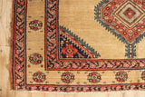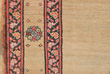 The camel field is absolutely sublime, woven with myriad subtle shades gives life, movement and energy to this artistic rug. The central medallions appear to float and the main border of rosettes on similar background suggests a never ending window effect. Very beautiful and elegant long rug.