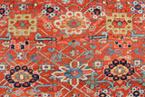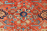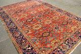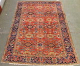 Antique Heriz carpet with lovely orangey-red ground colour and allover design of flowers connected by vines in yellow, light blue, navy blue, white and green. A very pleasing design and colour combination that is great for decorating. In excellent original condition.