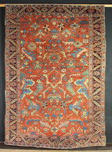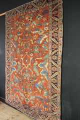 These small Heriz carpets with the allover design and sweet, sweet colour don't come around too often. Usually they are later, larger, with medallions or just plain old ugly but this is a superb small example. A terracotta field colour overlaid with various flowers and leaves in light blue, pale yellow, coral and a generous sprinkling of grass green, within a classic navy blue border. Showing some wear but clean, secure and ready for your floor.