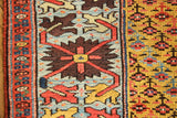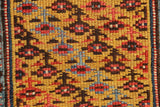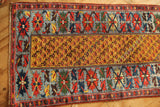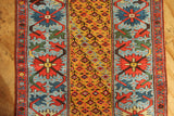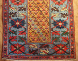An extremely unusual antique runner from Persian Kurdistan, circa 1880. I don't remember seeing one with such a pretty, wide light blue border and with a saffron yellow field colour. The design of small flowers is cleverly arranged in a slanting pattern and the light blue flowers really pop out nicely. Beautiful, long and narrow too! Clean and ready for your stairs of hallway.