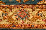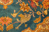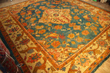 An antique Oushak carpet with a rich turquoise field colour in an imposing square size with a well spaced design of winged creatures flying between leaves, flowers and vines that are tumbling around as if in a strong wind. A very characterful carpet, with a strong Arts & Crafts feel to it. In excellent condition, showing light wear.
