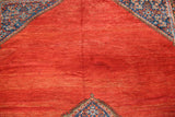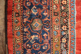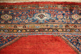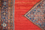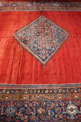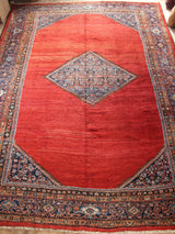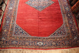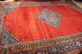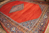 The gorgeous, abrashed rusty red field will warm up your living room to perfection. The mid blue medallion floats in an open field of many, many shades of madder which gives it so much depth and charm. A really beautiful, elegant carpet in a great size, in excellent condition.