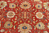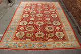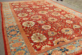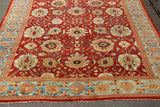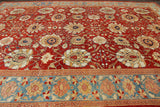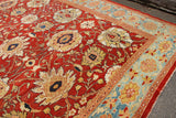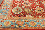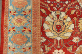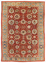 Top of the line example of the quintessential Ziegler; Huge round blossoms floating on a rich terracotta field with sky blue major border. The apex of Ziegler production and an extremely rare beauty.