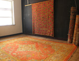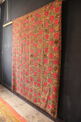 A large and beautiful early silk embroidery from Uzbekistan. Full of movement and articulation as the best Suzani should be. Green stemmed pink flowers are moving exuberantly all over the field and border. The embroidery itself is in excellent condition but there are several small holes to the ground, particularly corners, and the black dye has run here and there. Still a beautiful textile with a huge impact, and is priced according to the condition.