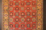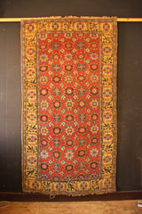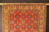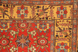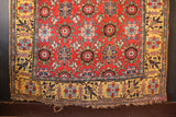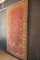 I love these fabulous old Bidjar carpets with the 'Mina Khani' design. This one is a great example for a number of reasons; It is the older type with a woollen warp and weft, it has a red ground and most unusually it has a golden yellow border. If you look closely at the Mina Khani, you will see that no two flowers are the same, even when they are meant to be, and the vines flowing in a circular motion that connect the flowerheads are also, jigging and bumping around. All of these small details add up to a captivating rug, a work of pure art, that gives great pleasure even after many years.